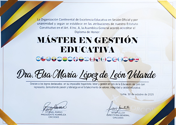 Con mucho orgullo y felicidad nuestra Directora Dra. Elsa López de León Velarde recibió el Diploma de Honor "Máster en Gestión Educativa", otorgado por la Organización Continental de Excelencia Educativa ORCODEE. Premio gracias a su logro destacado en su impecable trayectoria, labor y gestión en Pro de la Educación del país que representa, demostrando pasión y liderazgo en el fortalecimiento de valores, integridad y calidad educativa !!FELICITACIONES!!.